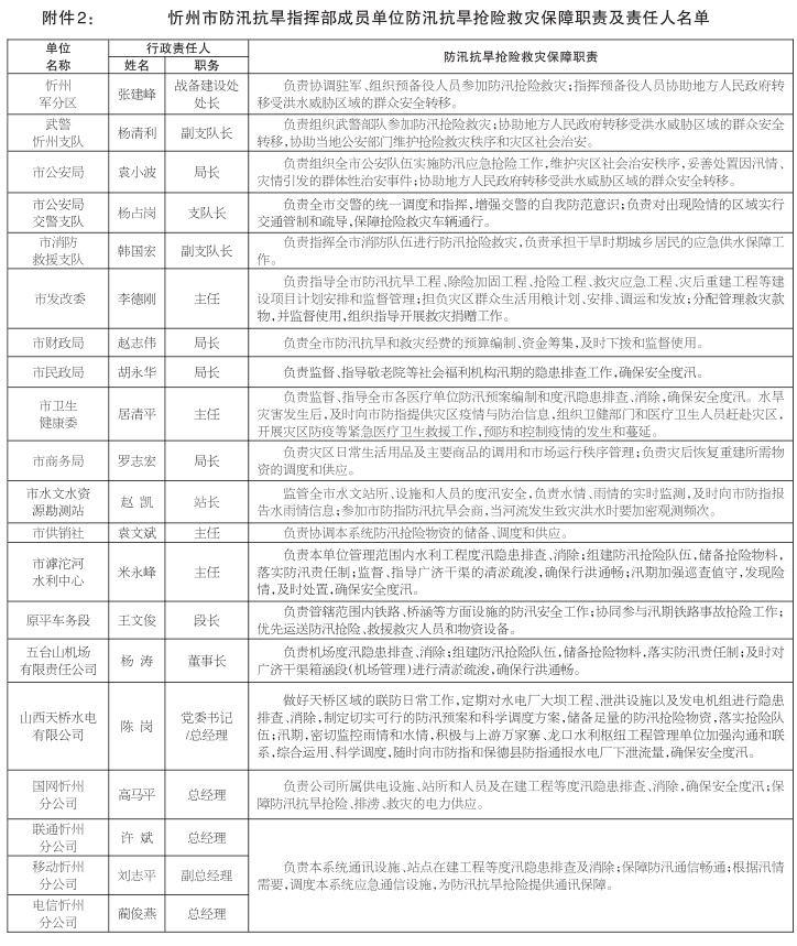 2.忻州市防汛抗旱指揮部成員單位防汛抗旱搶險救災(zāi)保障職責(zé)及責(zé)任人名單