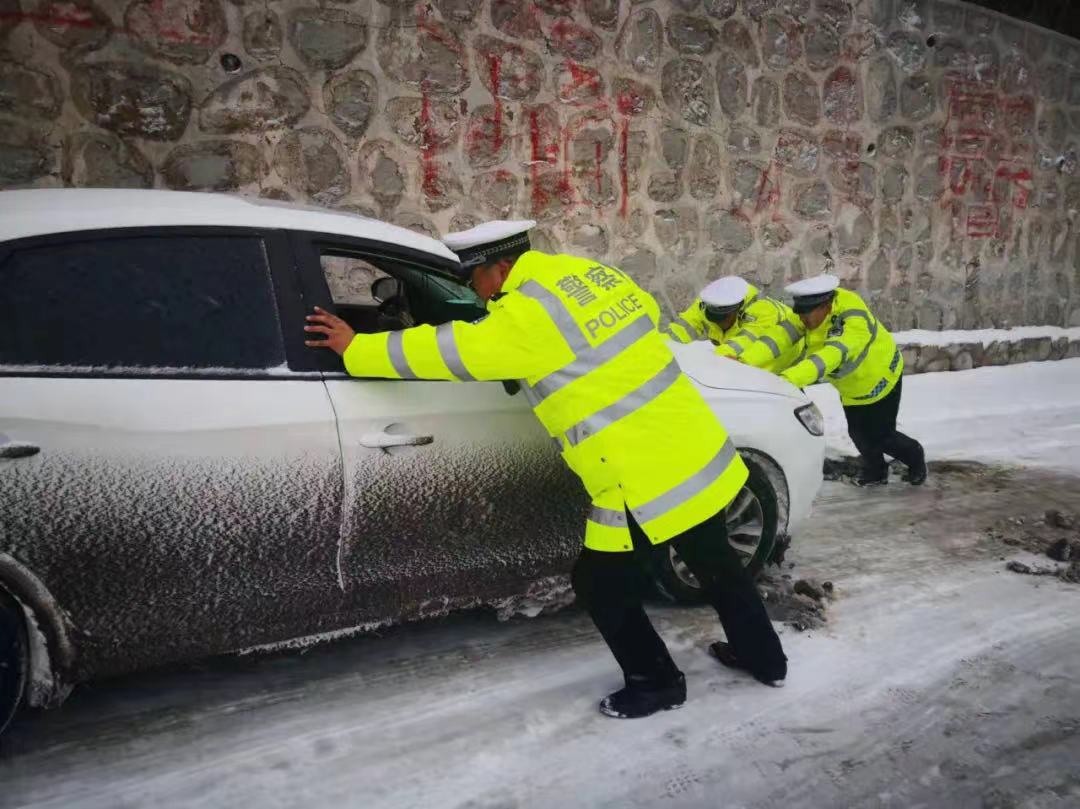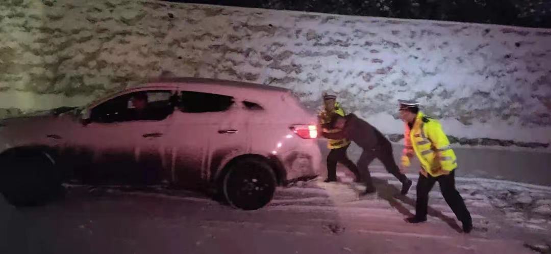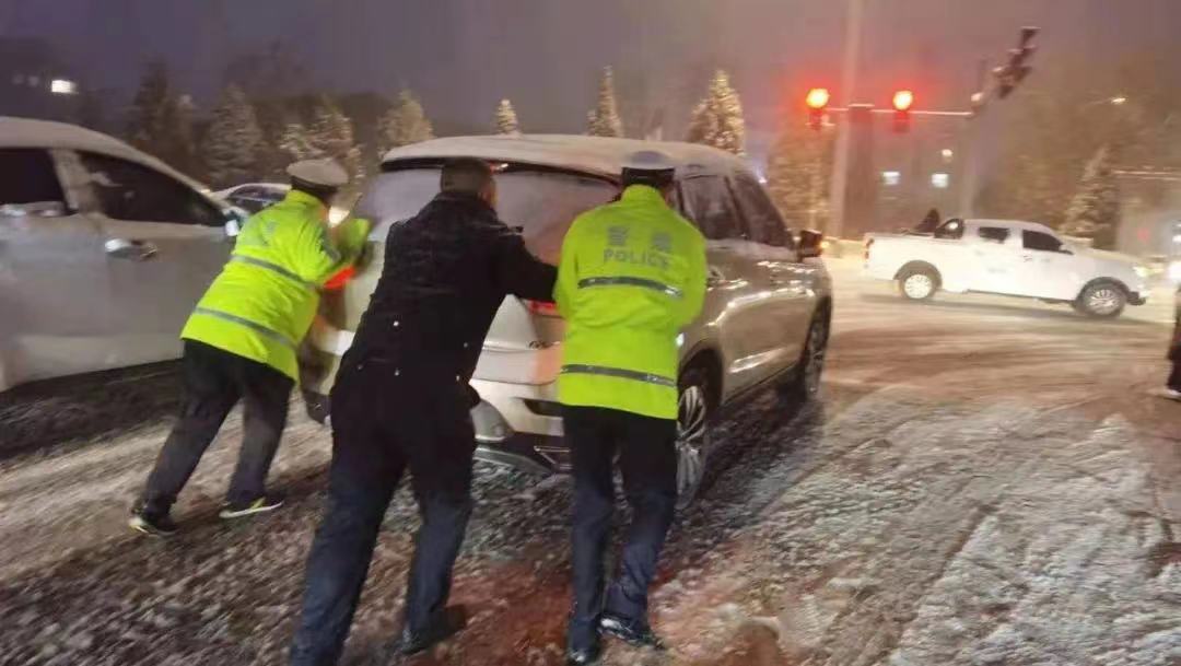 神池縣境內(nèi)夜間道路積雪較厚,澗口坡路段車輛打滑被困,安全股和龍泉中隊執(zhí)勤民輔警協(xié)助推車,全力保障人們出行平安 五寨