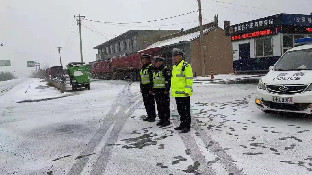 晚間,五臺山景區(qū)大雪,景區(qū)西線、北線道路濕滑,視線不佳,不具備車輛通行條件,五臺山公安交警繼續(xù)對西線、北線出山車輛進行臨時交通管控,提醒過往車輛繞行南線。 寧武 11月6日,寧武縣大范圍降雪。寧武交警陽方口中隊轄區(qū)路面被冰雪覆蓋,大型貨車滯留,爬坡難度大,極易造成側(cè)滑和碰撞。中隊民輔警以雪為令、迅速啟動惡劣天氣應(yīng)急預案,全警上路,堅守一線,冒嚴寒、踏雪水,在重要路段、墊土鋪沙,讓滯留大貨車緩慢有序通行。確保道路安全暢通。 岢嵐