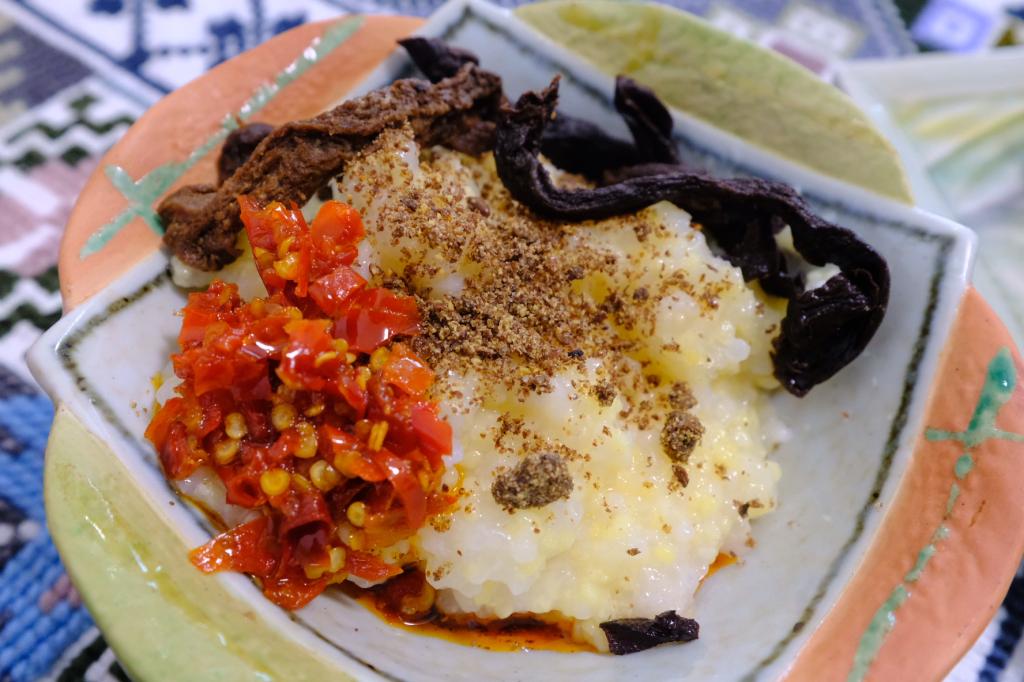 不論城里還是鄉(xiāng)村 人們每年從開(kāi)春至入冬 尤其盛夏時(shí)一日三餐都以此為食 ▼ (酸粥配上偏關(guān)人自制的紅腌菜、麻面子,甚是美味。攝影趙婧)
