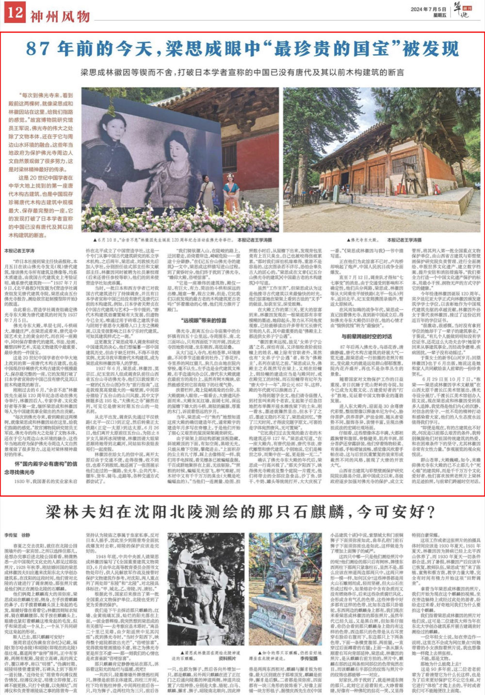 “昨日本社接到梁主任快函報(bào)稱,本月五日在該山佛光寺發(fā)見(現(xiàn))唐代建筑,緣該佛光寺所有建筑及佛像等,均系木質(zhì)建造,由我國(guó)古代建筑史上考驗(yàn)證明,確系唐代建筑物……”1937年7月9日,《北平晨報(bào)》刊發(fā)題為《營(yíng)造學(xué)社調(diào)查組發(fā)見唐代建筑寺院,梁思成由五臺(tái)佛光寺報(bào)告,測(cè)繪故宮趕制模型即開始》的報(bào)道。