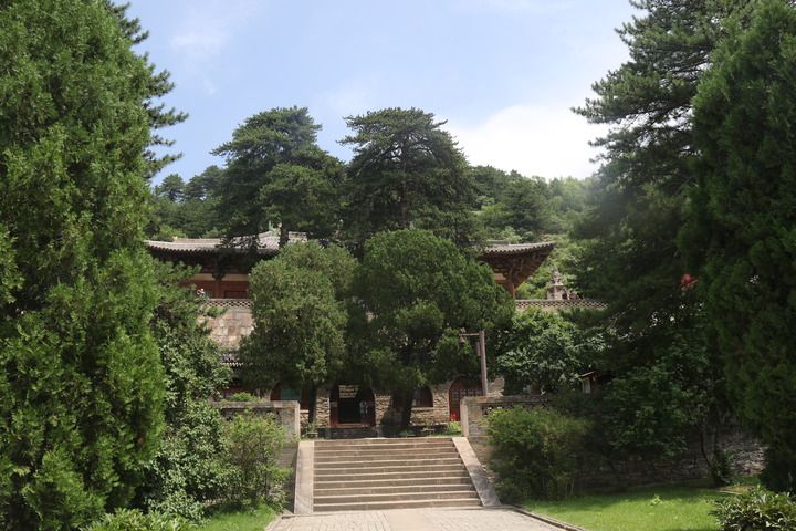 從大門邁入寺內(nèi),松柏蒼翠,環(huán)境清幽,不同季節(jié)還能看到牡丹、丁香花開。寺里養(yǎng)的網(wǎng)紅貓兒、狗兒自由地在院內(nèi)穿梭,毫不認(rèn)生。左手邊是金代建筑文殊殿,右手邊通向辦公區(qū),唐代東大殿就建在最前方的高臺(tái)上,雖然有樹木掩映,依然能感受到它居高臨下的壯觀氣勢(shì)。