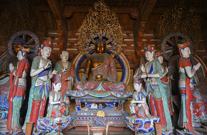 進(jìn)入東大殿內(nèi),迎面是30余尊唐代彩塑。整組塑像以釋迦牟尼為中心,脅侍菩薩、供養(yǎng)菩薩、護(hù)法金剛、隨從者姿勢(shì)不同,服飾各異,表情豐富,呈現(xiàn)出佛祖說法的宏闊壯觀場(chǎng)面。