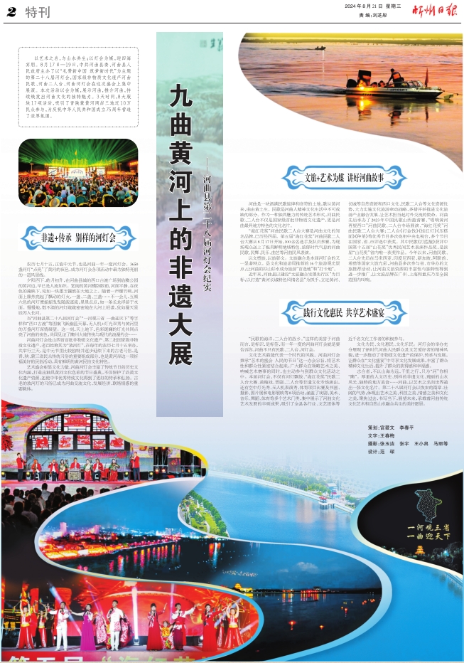 以藝術(shù)之名,與山水共生;以燈會為媒,迎四海賓朋。8月17日—19日,中共河曲縣委、河曲縣人民政府主辦了以“禮贊新中國 筑夢新時代”為主題的第二十八屆河燈會,國家級非物質(zhì)文化遺產(chǎn)河曲民歌、河曲二人臺、河曲河燈會在這次盛會上集中展演。本次活動以會為媒,展示河曲,推介河曲,持續(xù)煥發(fā)出河曲文化的獨特魅力。3天時間,8大版塊17項活動,吸引了晉陜蒙黃河兩岸三地近10萬民眾參與,為慶祝中華人民共和國成立75周年營造了濃厚氛圍。