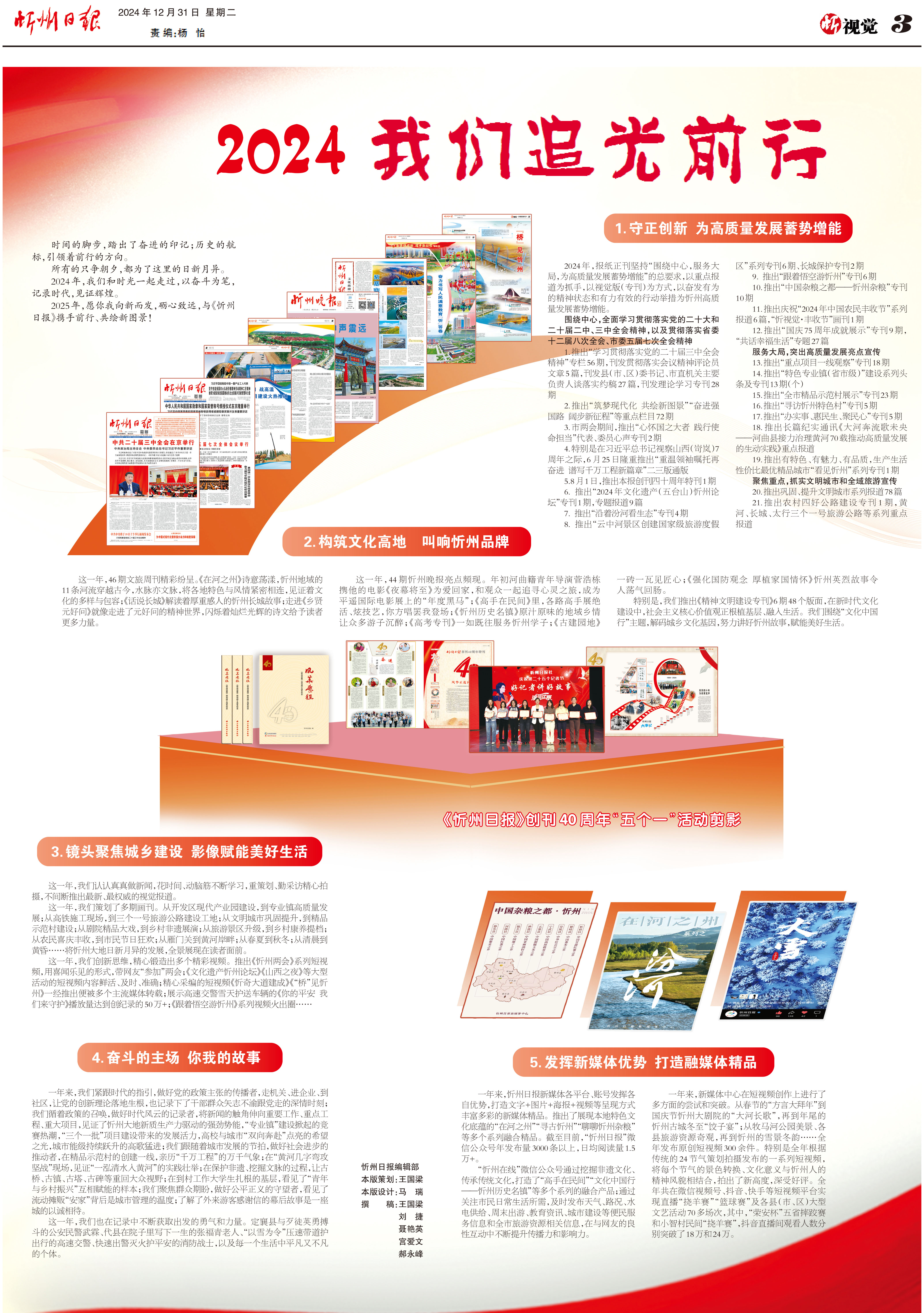 2024年,報紙正刊堅持“圍繞中心,服務大局,為高質量發(fā)展蓄勢增能”的總要求,以重點報道為抓手,以視覺版(??榉绞?,以奮發(fā)有為的精神狀態(tài)和有力有效的行動舉措為忻州高質量發(fā)展蓄勢增能。