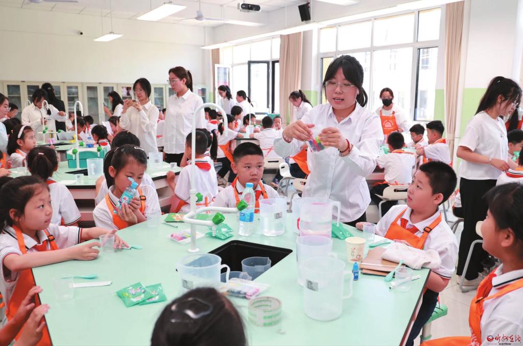 5月14 日,忻州師范學院生物系和忻州市七一路小學聯(lián)合舉辦“探尋奇妙生物,解鎖生命密碼”動植物科普進校園活動。圖為大學生們指導孩子們進行科學實驗。 (