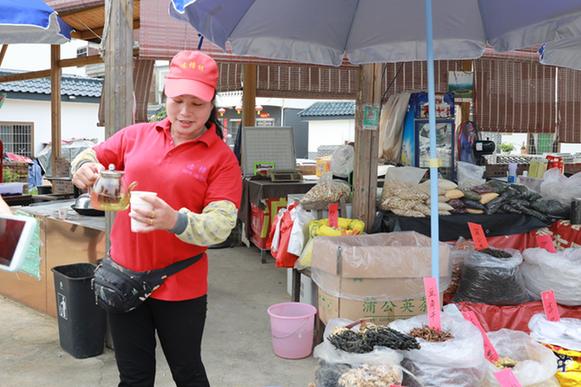 “天太熱,來(lái)喝口我這免費(fèi)的茶?!辈湃脒B樟村村口,記者便被熱情的村民陸秀媚招呼到了自己的攤位。紅茶、本地枝葉、山柑皮、筍干……她的攤位琳瑯滿目,擺得滿滿當(dāng)當(dāng)。陸秀媚告訴記者,自己曾經(jīng)在市里賣童裝,剛開始還能掙到些錢,后來(lái)隨著網(wǎng)購(gòu)興起,實(shí)體店的生意越來(lái)越難做。2018年,在習(xí)近平總書記來(lái)連樟村視察后,看到家鄉(xiāng)越變?cè)胶茫懶忝倪x擇了回到村里創(chuàng)業(yè)。