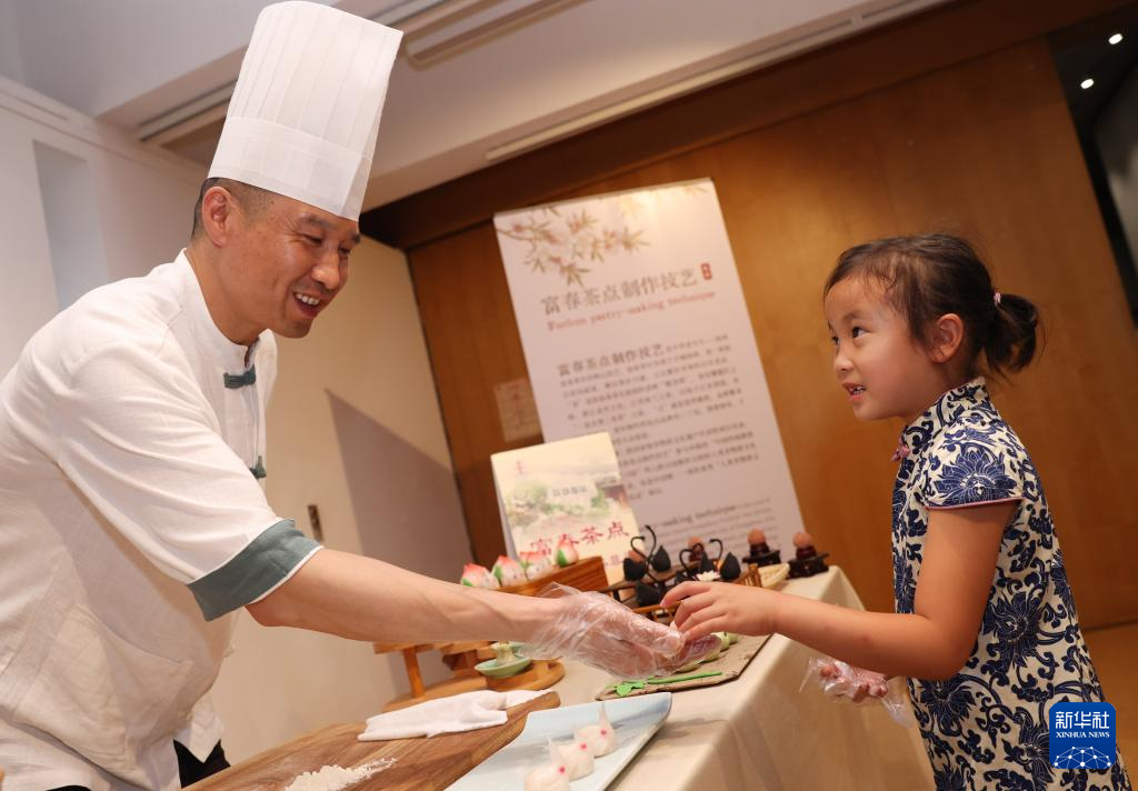7月11日,在位于法國(guó)巴黎的聯(lián)合國(guó)教科文組織總部,南京雨花茶傳承人陳盛峰演示制作雨花茶。