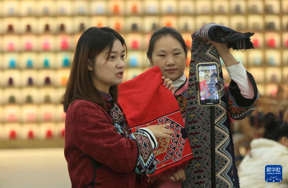 11月12日,在張家界市武陵源區(qū)乖幺妹土家族織錦基地,工人在直播銷售土家族織錦產(chǎn)品。