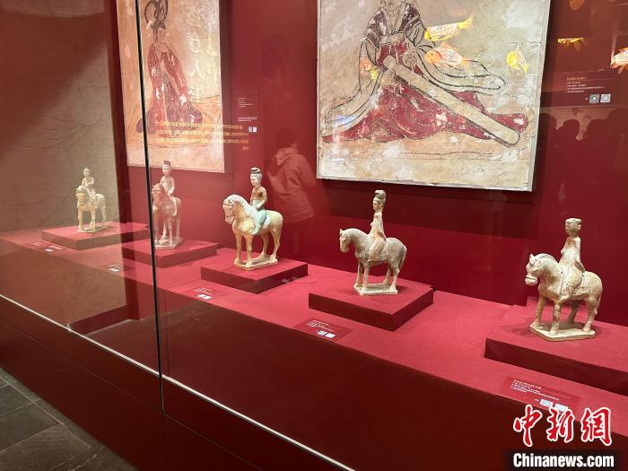 唐墓中的壁畫和彩色陶俑是唐代極具代表性的藝術(shù)珍品。記者在展廳看到,女性陶俑類型多樣,各種女坐俑、立俑、侍俑、樂(lè)舞俑、騎馬俑、貴婦俑……這些女俑造型生動(dòng),尤其是三彩女俑,釉色艷麗,呈現(xiàn)了唐代女性“千人千面”的生存狀態(tài)。