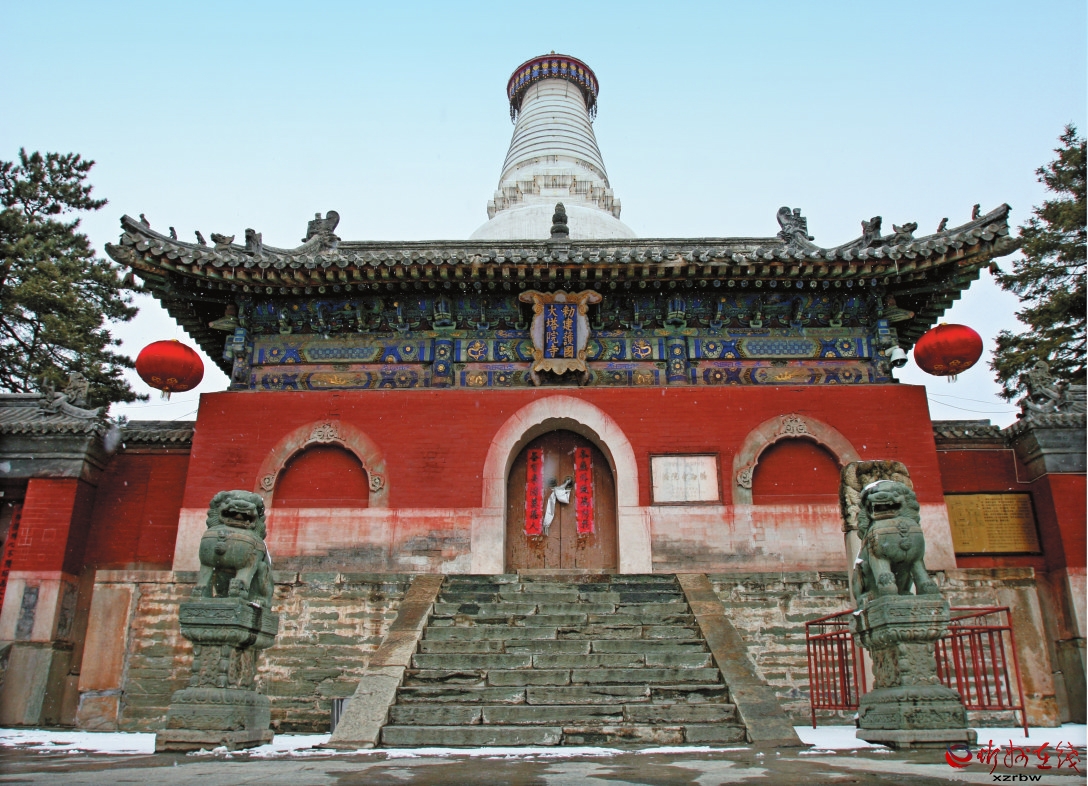 大白塔全名釋迦文佛真身舍利寶塔。該塔在元大德五年(公元1302年)由尼泊爾匠師阿尼歌設(shè)計建造,塔身用石頭砌成。地上部分高度為56.37米,比北京北海大白塔高20.4米,故有“清涼第一圣境”的美譽(yù)。大白塔之東,一進(jìn)三院。前院為都綱院,中院為錢糧庫,后院為方丈院。