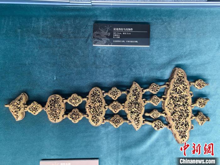 4月9日,金龍巧牽京藏情——《高原中華龍》主題展覽在北京西藏文化博物館開(kāi)幕。圖為展品雙龍獸紋馬具飾件。中新網(wǎng)記者 劉玥晴 攝