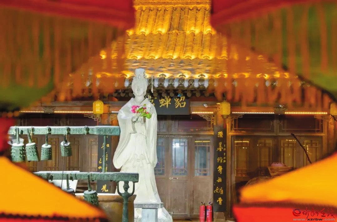 現(xiàn)在的貂蟬陵園是在墓地原址重新筑砌的,坐北朝南,門檐上懸“貂蟬陵園”橫匾,兩側(cè)有“閉月羞花堪為中國驕傲,忍辱步險實令須眉仰止”的金文楹聯(lián)。園內(nèi)用花墻分隔成南、北兩部分,北為陵區(qū),南為展區(qū)。南院建貂蟬彩塑館,再現(xiàn)“貂蟬迎賓”“羞花問世”“祭山驚艷”“落難認(rèn)父”“拜月銘志”“憂國請纓”“施計除奸”“繡袍寄情”等場面,反映了貂蟬“不惜萬金軀,何懼險象生”的一生。