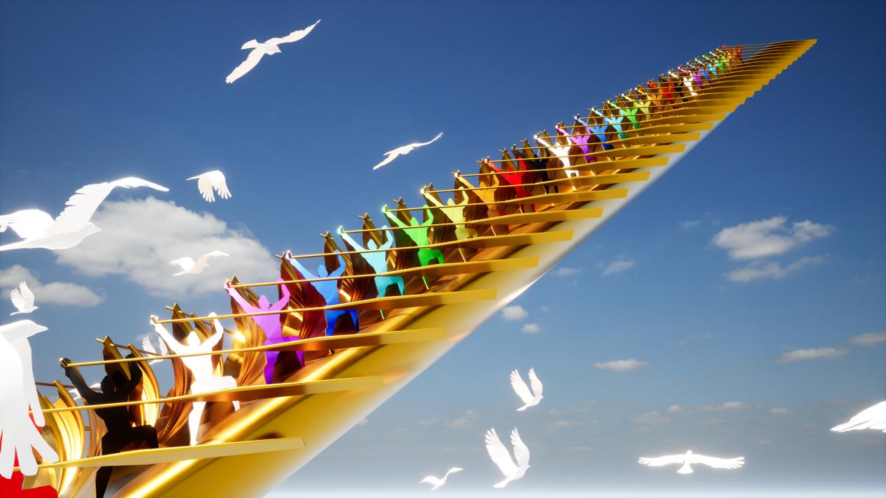 《命運(yùn)之舟》雕塑作品以巨輪、龍舟、方舟、飛船的象征意義與形態(tài),概括提煉為國(guó)際化新圖騰雕塑,舟上迎著藍(lán)天劃向未來(lái)的72位奮力劃槳者,不分國(guó)度、不分種族、不分膚色,這是世界人民風(fēng)雨同舟、命運(yùn)共同的象征。其宏偉的規(guī)模、深刻的寓意和精湛的藝術(shù)手法,成為本次文旅博覽會(huì)的一大亮點(diǎn)。