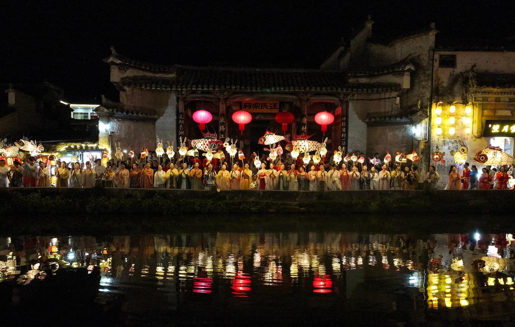 9月15日,花燈表演隊伍在安徽省黃山市黟縣宏村巡游(無人機照片)。新華社發(fā)(施亞磊 攝)