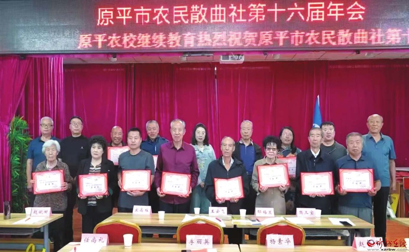 散曲社朗誦部的曲友們在悠揚音樂聲中,激情澎湃地朗誦著五谷飄香的農(nóng)民散曲,20多名優(yōu)秀社員受到表彰,展示出原平農(nóng)民散曲的喜慶豐收景象?!霸娙绯保r(nóng)民種曲名聲在,情如火,南腔北調(diào)心澎湃。曲如海,同舟共濟承傳愛,暖如春,一年四季花不敗。花開滿地鮮,曲韻熔天籟,好一個震驚曲界田園派?!边@首散曲《正宮·塞鴻秋》道出了散曲社社員們的心聲。
