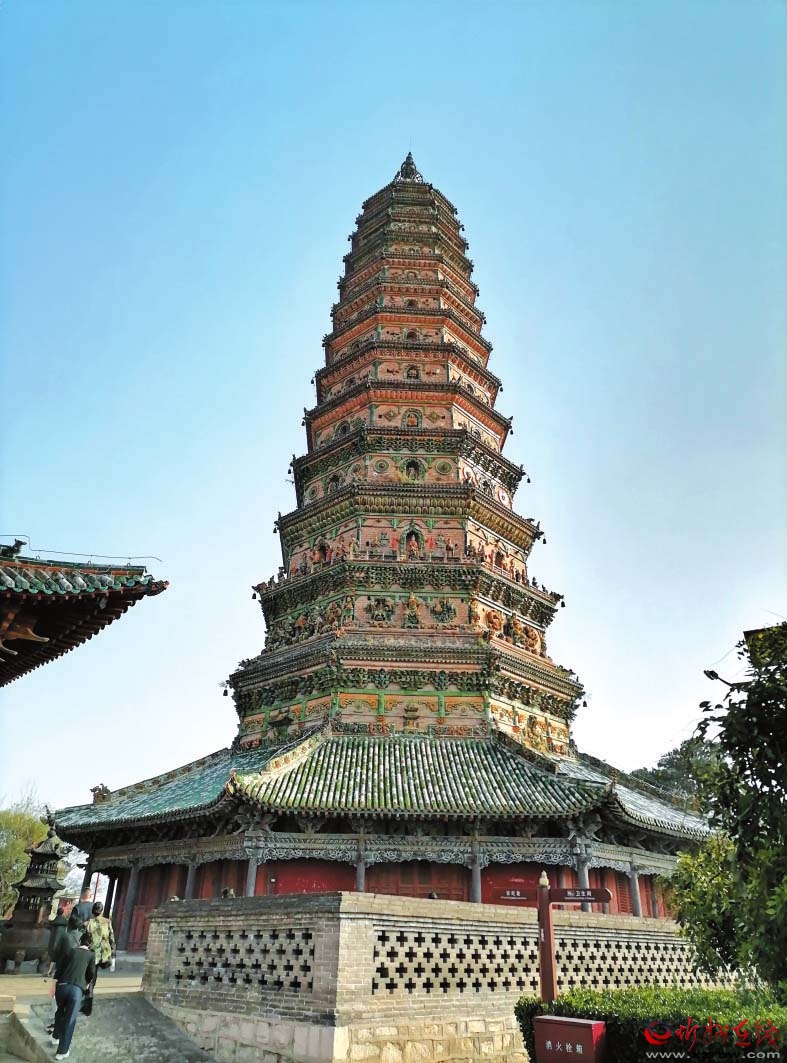 在洪洞縣,有一座舉世聞名的佛教古剎廣勝寺,“三絕一奇”令人驚嘆。一絕是飛虹琉璃塔,是廣勝寺標(biāo)志性建筑,被推為全國第一塔,塔身外部有七色琉璃構(gòu)件與裝飾圖形,每一層都有一組中心圖案,生動逼真,色彩艷麗,被認(rèn)證為“世界最高的多彩琉璃塔”。二絕是《趙城金藏》,是玄奘從天竺取回的梵文經(jīng)卷中譯善本,世界上僅此一部,被譽(yù)為稀世珍寶。三絕是元代壁畫。內(nèi)容以祈雨、行雨、酬神等生活場景為主,布局嚴(yán)謹(jǐn),造型生動,堪稱我國風(fēng)俗神話題材的壁畫杰作。一奇是左右扭古柏,有1300余年歷史,一東一西,像兩位護(hù)法將軍守衛(wèi)著大殿。兩株古柏,左邊的朝左扭,右邊的向右扭,甚為奇特。