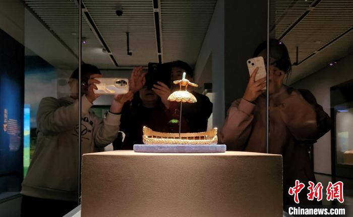 在山東博物館鄂爾多斯青銅文明展現場,觀眾欣賞匈奴鷹頂金冠。趙曉 攝