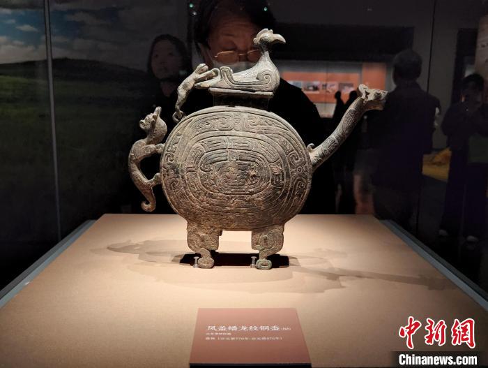 觀眾在展覽現場欣賞鳳蓋蟠龍紋銅盉。趙曉 攝