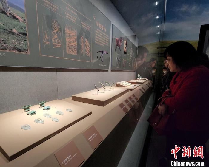 記者在展廳內看到,眾多青銅制品以動物形象為裝飾題材,猛虎、野狼、駿馬、鷹隼等姿態(tài)奔放、形象生動,折射游牧民族對生命力的崇拜。