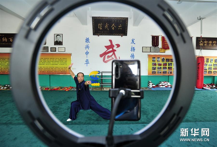 8月5日,石同鼎直播六合拳拳法。時值暑假,為減少聚集習武帶來的疫情風險,同時豐富孩子們的暑期生活,六合拳第八代傳承人石同鼎在直播平臺開通了賬號,每天帶領學生進行網(wǎng)絡直播教學演示,通過“云端”傳承非遺文化。 今年59歲的石同鼎是泊頭六合拳第八代傳人,他自幼跟隨父親習武。2001年父親離世后,石同鼎便承擔起傳承六合拳的重任。2002年石同鼎建起六合武館,開始教徒弟習武練拳。 作為傳統(tǒng)武術中長拳的一種,河北的泊頭六合拳有400余年歷史,被列入國家級非物質文化遺產(chǎn)名錄。 “通過網(wǎng)上直播,更多的人可以了解六合拳、練習六合拳。”石同鼎說,他希望能把六合拳推向世界,傳得更遠。新華社記者 牟宇 攝