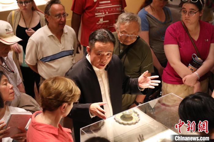 2019年6月,柏群在美國華盛頓的一家博物館向觀眾介紹金漆鑲嵌技藝。 (受訪者供圖)