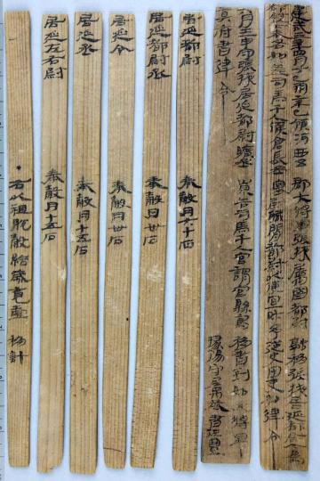 “建武三年四月丁巳朔辛巳,領(lǐng)河西五郡大將軍張掖屬國(guó)都尉融移張掖居延都尉,今為都尉以下奉各如差,司馬千人候倉(cāng)長(zhǎng)丞塞尉職閑,都尉以便宜財(cái)予,從史田吏如律令……”出土于內(nèi)蒙古額濟(jì)納旗甲渠候官遺址的《建武三年居延都尉吏奉例》由10枚簡(jiǎn)組成,每簡(jiǎn)長(zhǎng)22.8厘米,前兩簡(jiǎn)寬2.5厘米、其余8簡(jiǎn)寬1.4厘米,全文200字。