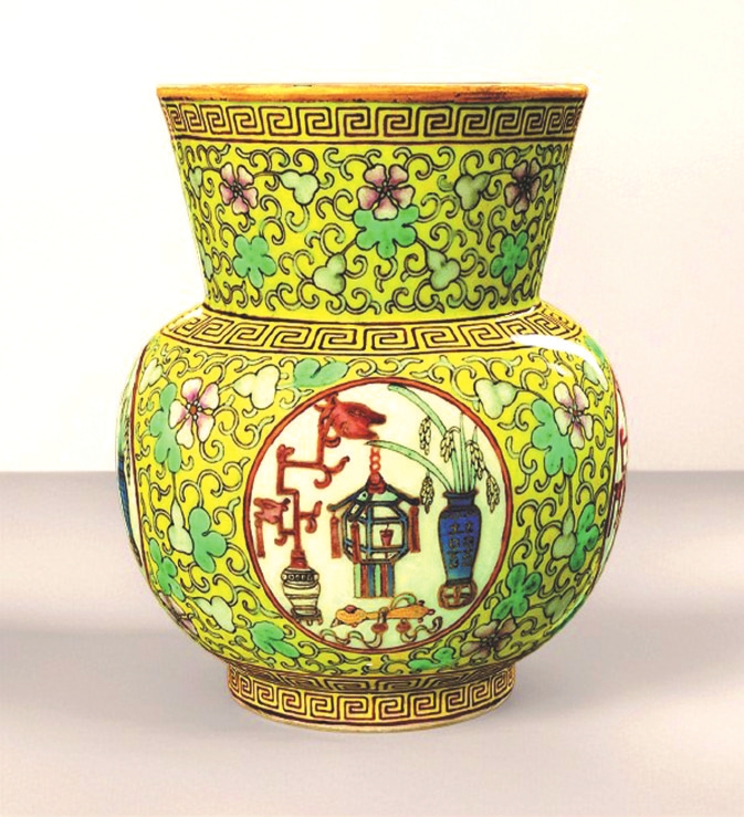 故宮博物院收藏的清代粉彩葫蘆萬代五谷豐登紋渣斗,內(nèi)壁繪粉彩纏枝葫蘆紋,藤蔓相連,花果繁茂,寓意“子孫綿延”“多子多?!保煌獗邳S地亦繪相同葫蘆紋,設(shè)四處圓形開光,內(nèi)有宮燈、花瓶、如意、稻穗等,寓意“平安如意”“五谷豐登”。開光內(nèi)花瓶飾“囍”字,表明為皇帝大婚用瓷,既祈子嗣繁衍,又添喜慶吉祥。整器色彩明艷,紋飾繁密華麗,盡顯清代晚期宮廷裝飾的典型風(fēng)格。