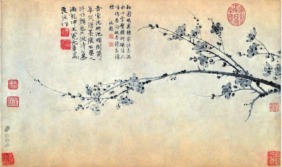 以梅入畫,最早出現(xiàn)于南北朝時(shí)期,不過(guò)并未成氣候,直到宋代,以梅花入題的中國(guó)畫才顯露實(shí)績(jī)。人們所熟知的“梅妻鶴子”典故與北宋隱士林逋有關(guān),雖以愛(ài)梅著稱,但他并無(wú)梅花繪畫作品傳世。被稱為“墨梅始祖”的僧人仲仁亦活躍于宋代,他以水墨深淺描摹梅花,全然摒棄色彩,后世稱之為“墨梅”。