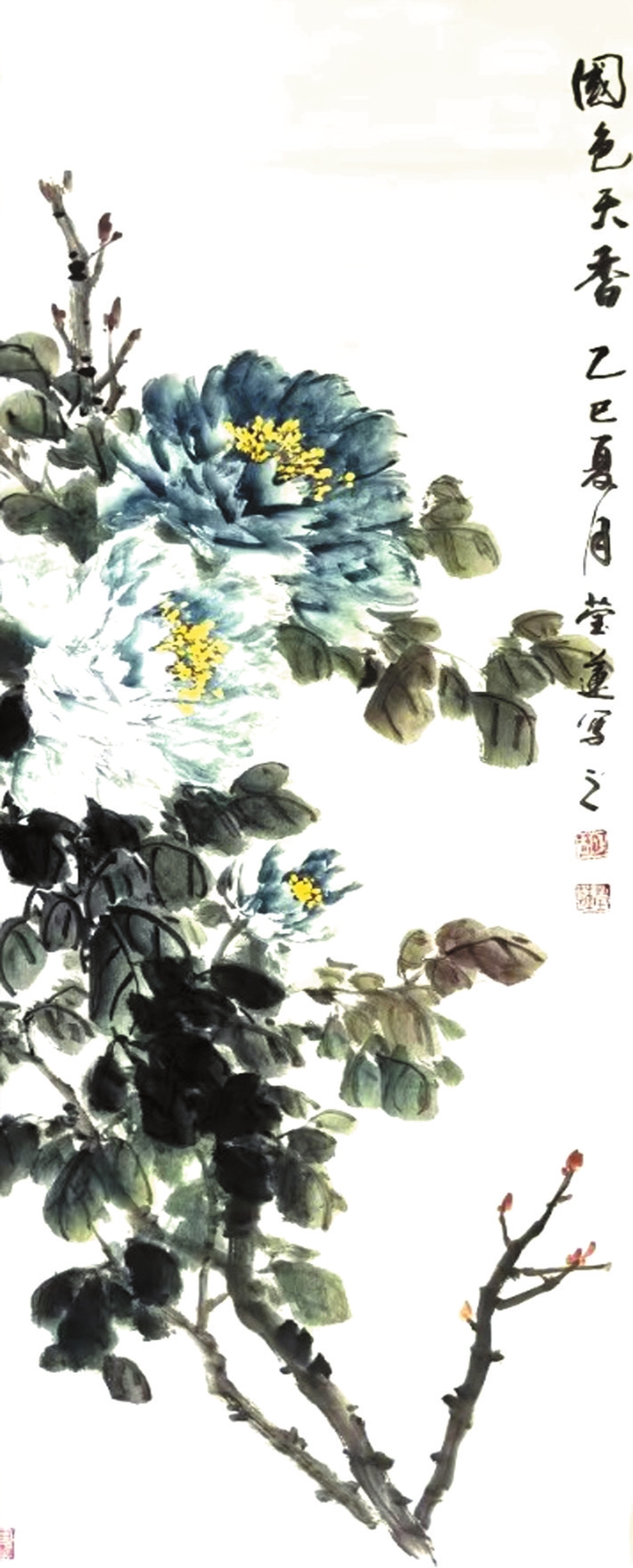 胡瑩蓮的筆墨并非刻意炫技,而是循著“應(yīng)物象形”之理自然生發(fā):牡丹花瓣以淡彩層層暈染,輔以墨線勾勒輪廓,既顯牡丹的華貴之姿,亦存筆墨的清勁骨力;紫藤枝條以側(cè)鋒揮掃而出,既有“折釵股”般的圓勁質(zhì)感,亦見藤蔓的靈動意趣。恰如北宋畫家郭熙在《林泉高致》中所言的“筆補造化”,胡瑩蓮以筆墨為媒介,貫通物象的自然本真與人文意蘊。