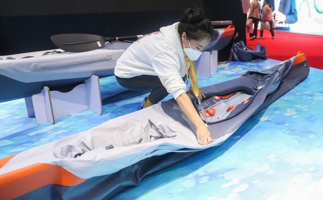 11月6日,工作人員在進(jìn)博會消費(fèi)品展區(qū)的迪卡儂展臺演示可折疊皮劃艇如何安裝。新華社記者 丁汀 攝