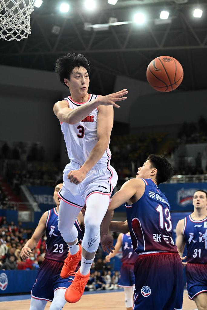 12月11日,廣東隊(duì)球員胡明軒(上)在籃下傳球。新華社記者 孫凡越 攝