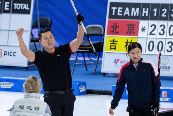 20日,在第十四屆全國冬季運(yùn)動(dòng)會(huì)冰壺(公開組)混雙決賽中,黑龍江隊(duì)以7:6險(xiǎn)勝福建隊(duì),奪得金牌。