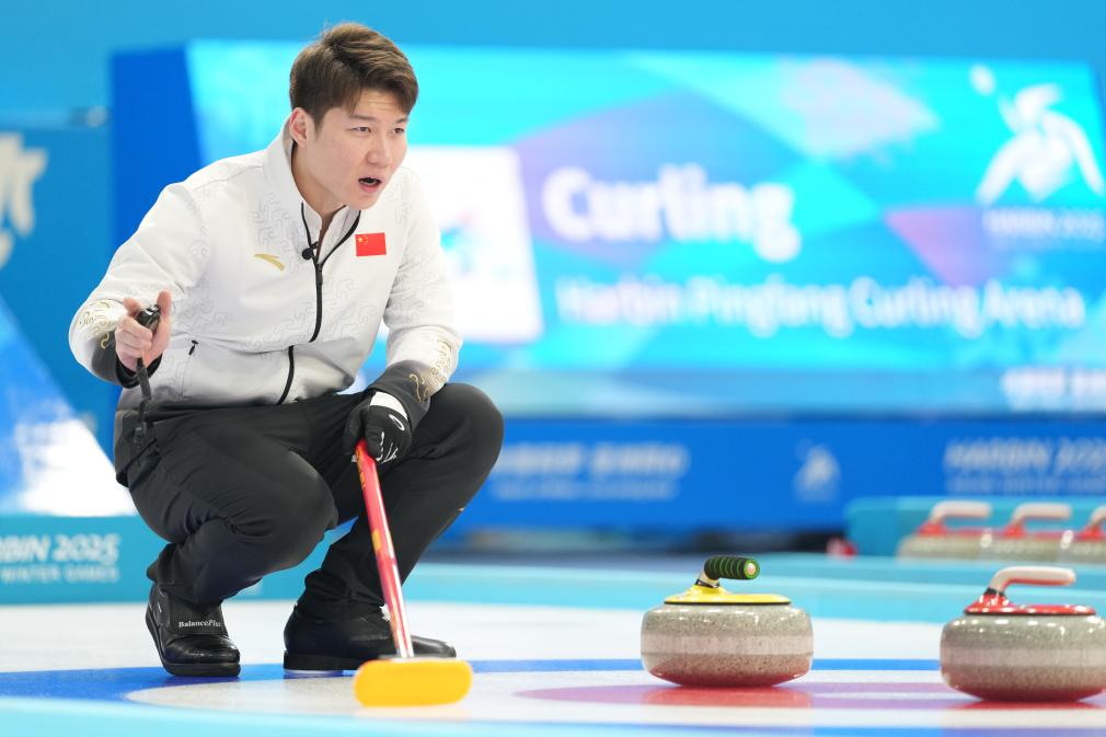 2月6日,中國隊選手王智宇在比賽中指揮隊友擦冰。當日,在哈爾濱舉行的第九屆亞冬會冰壺混雙循環(huán)賽B組第6輪比賽中,中國隊6比4戰(zhàn)勝韓國隊。新華社記者 王松 攝