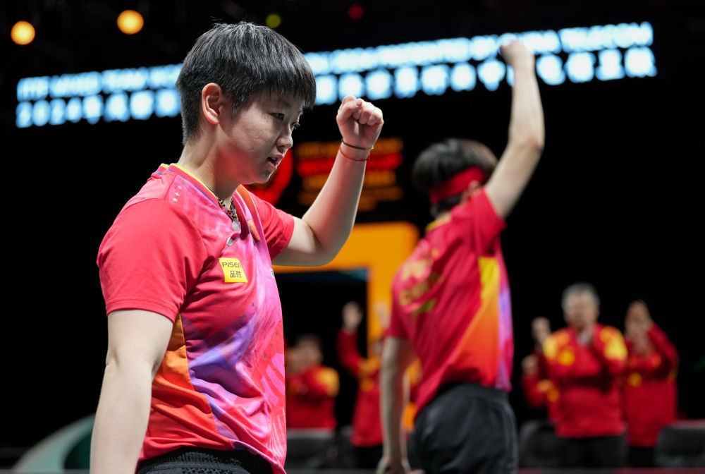 2024年12月8日,中國隊(duì)組合王楚欽/孫穎莎(左)在得分后慶祝。當(dāng)日,在四川成都舉行的2024年成都國際乒聯(lián)混合團(tuán)體世界杯決賽中,中國隊(duì)總比分8比1戰(zhàn)勝韓國隊(duì),獲得冠軍。新華社記者 江宏景 攝