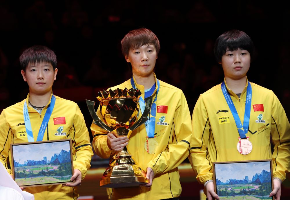 2月23日,冠軍王曼昱(中)、亞軍孫穎莎(左)和季軍蒯曼在頒獎儀式上合影。當(dāng)日,在廣東深圳舉行的第34屆國際乒聯(lián)-亞乒聯(lián)盟亞洲杯女子單打決賽中,中國選手王曼昱4比0戰(zhàn)勝隊(duì)友孫穎莎,奪得冠軍。新華社記者 盧漢欣 攝