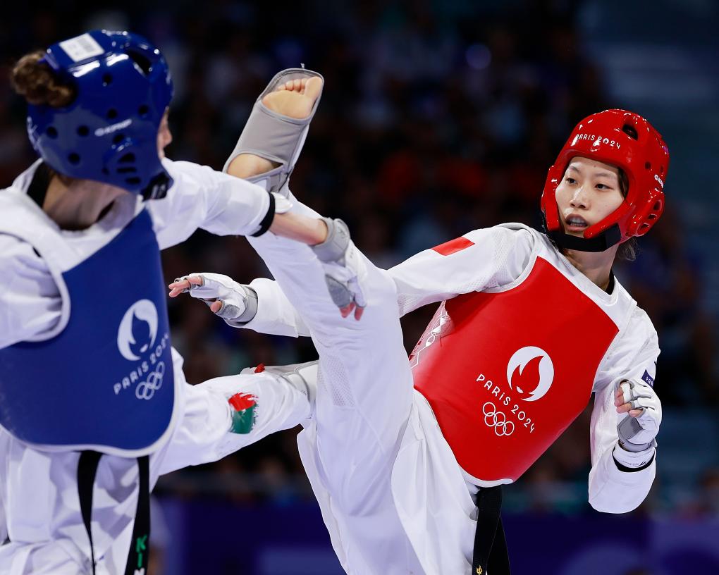 2024年8月8日,中國選手駱宗詩(右)在巴黎奧運(yùn)會(huì)跆拳道項(xiàng)目女子57公斤級(jí)銅牌賽上。新華社記者 費(fèi)茂華 攝