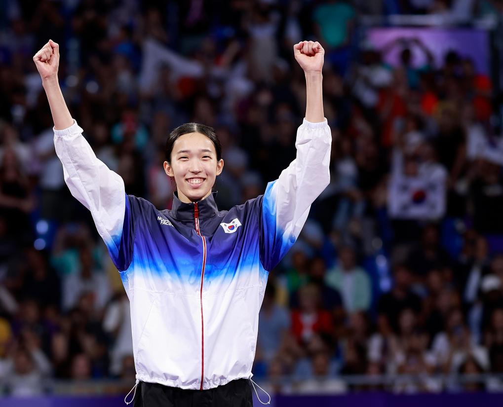 2024年8月8日,獲得冠軍的韓國選手金宥珍在巴黎奧運(yùn)會(huì)跆拳道女子57公斤級(jí)決賽頒獎(jiǎng)儀式上。新華社記者 費(fèi)茂華 攝