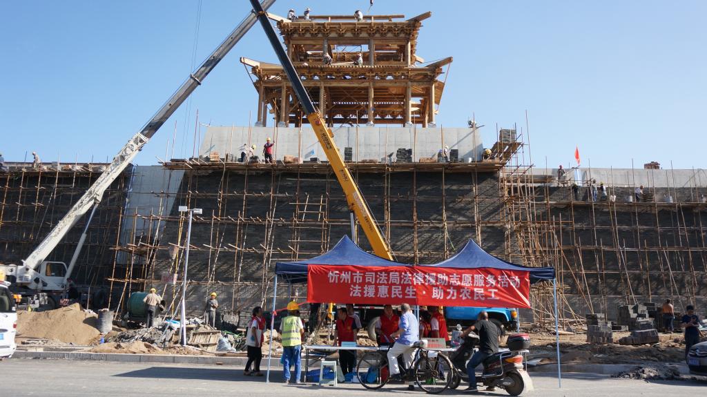 為深入貫徹落實(shí)習(xí)近平新時代中國特色社會主義思想和黨的十九大及十九屆二中、三中、四中全會精神,貫徹落實(shí)《保障農(nóng)民工工資支付條例》和國家、山西省關(guān)于農(nóng)民工服務(wù)工作的部署,切實(shí)加強(qiáng)我市農(nóng)民工安全生產(chǎn)意識,提高農(nóng)民工的維權(quán)意識和維權(quán)能力,8月13日下午,忻州市司法局組織市法律援助中心、公證處、律師事務(wù)所、司法鑒定中心組成法律援助志愿服務(wù)隊(duì),走進(jìn)忻州古城建筑工地現(xiàn)場,開展了“法援惠民生·助力農(nóng)民工”法律援助志愿服務(wù)活動。