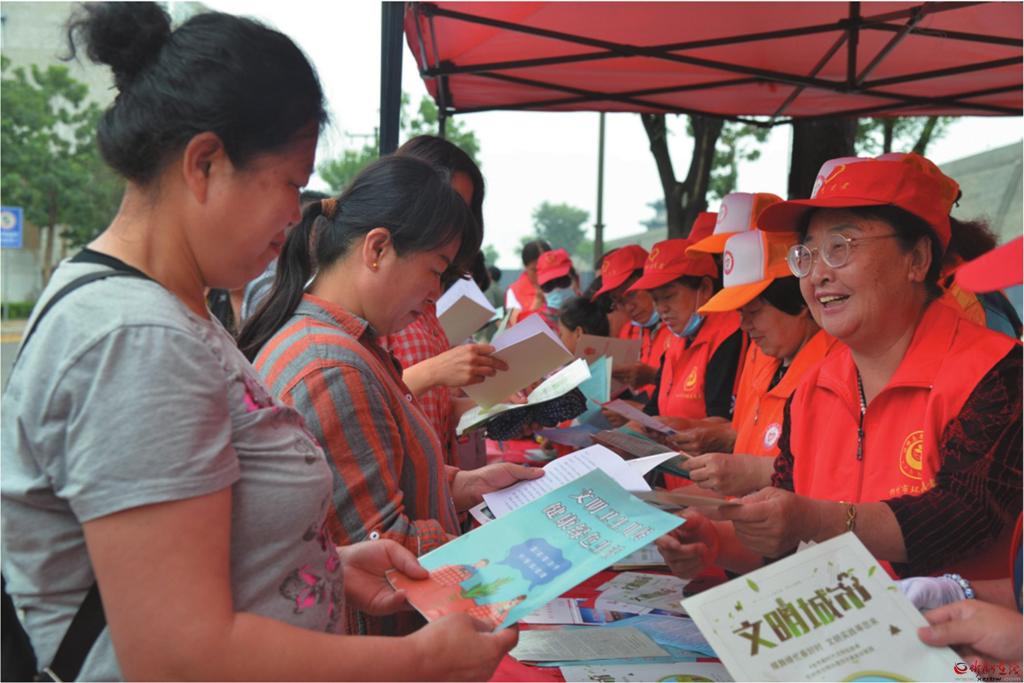 志愿者為過(guò)往群眾發(fā)放創(chuàng)文宣傳資料 本報(bào)通訊員 攝