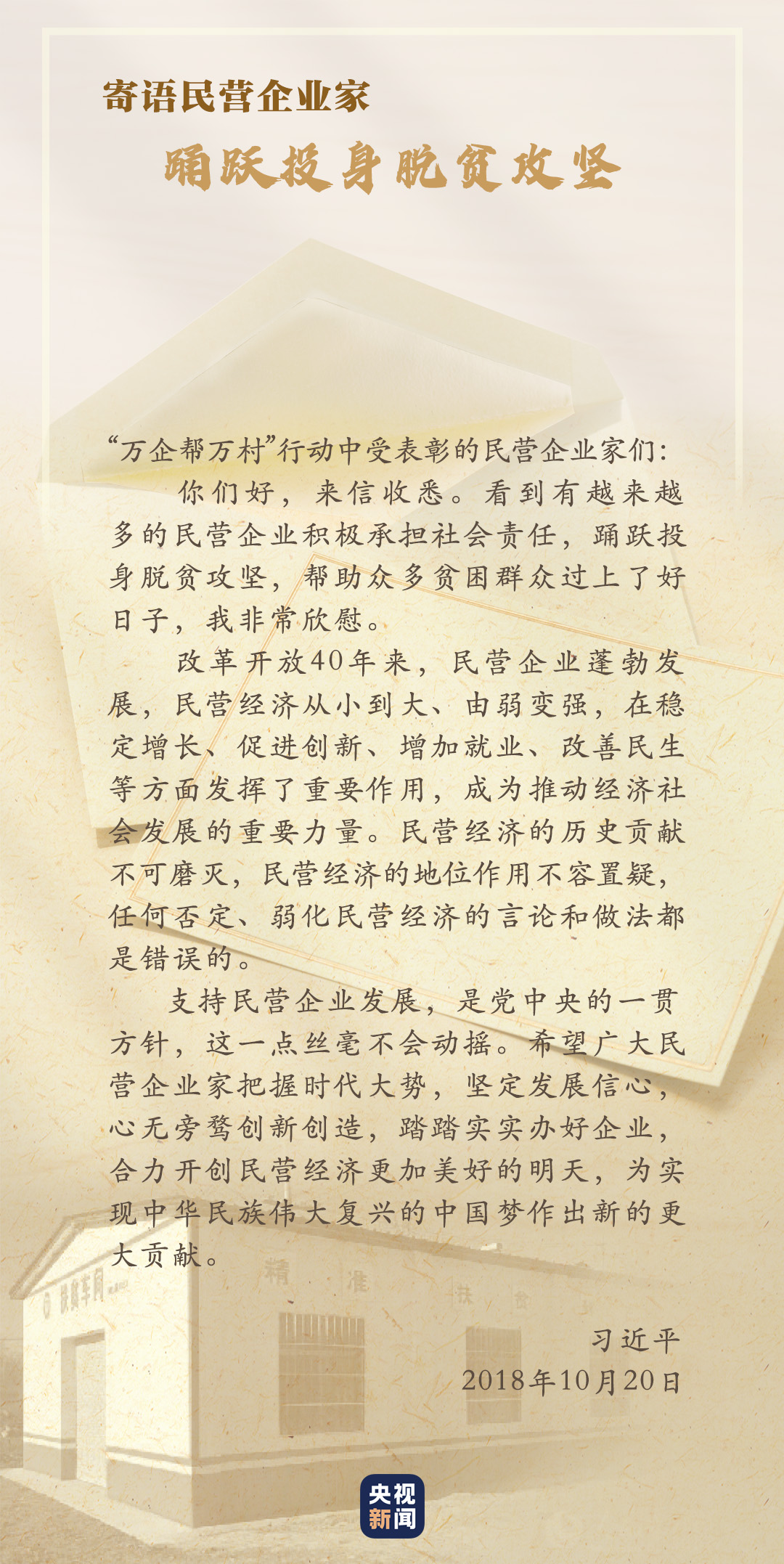 習(xí)近平對(duì)民營(yíng)企業(yè)高度重視,給“萬(wàn)企幫萬(wàn)村”行動(dòng)中受表彰的民營(yíng)企業(yè)家回信,對(duì)他們踴躍投身脫貧攻堅(jiān)予以肯定,勉勵(lì)廣大民營(yíng)企業(yè)家堅(jiān)定發(fā)展信心,踏踏實(shí)實(shí)辦好企業(yè)。