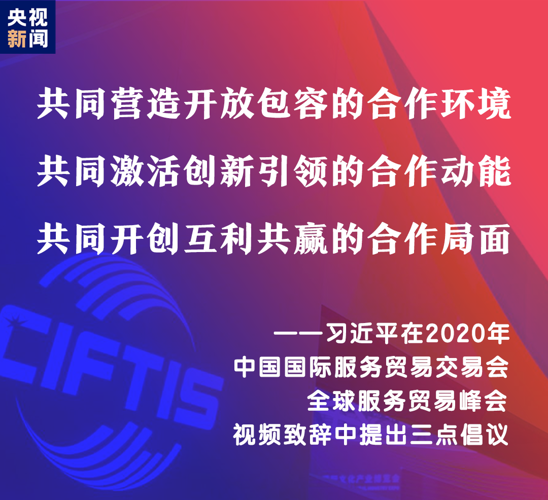 習(xí)近平表示,中國舉辦2020年中國國際服務(wù)貿(mào)易交易會(huì),就是搭建起平臺和橋梁,讓各國人民充分展示服務(wù)貿(mào)易領(lǐng)域新發(fā)展新突破,共同享受人類社會(huì)發(fā)展進(jìn)步新技術(shù)新成果。