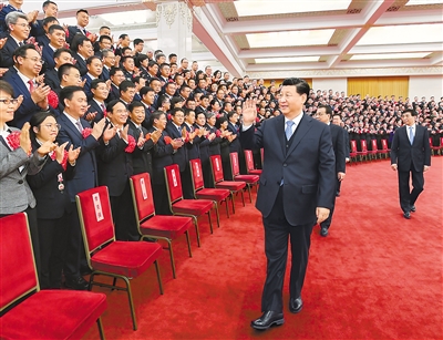 下午3時30分,習近平等來到人民大會堂北大廳,全場響起熱烈掌聲。習近平等向代表們揮手致意,同大家親切交流并合影留念。