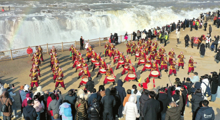 ①1月30日,吉縣壺口瀑布景區(qū)邀請(qǐng)鼓樂隊(duì),為游客呈現(xiàn)了一場(chǎng)特色鮮明、氣勢(shì)恢宏的視覺盛宴。