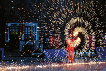 大槐樹(shù)景區(qū)在春節(jié)夜間游覽期間還邀請(qǐng)了網(wǎng)絡(luò)大火的“火”系非遺表演——“飛天鳳舞·鐵花魂”活動(dòng),其中囊括噴火、打火花、火壺等,為游客們奉上一場(chǎng)絢爛奪目的非遺盛宴。