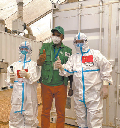2020年9月2日,在幾內(nèi)亞首都科納克里的一個(gè)核酸檢測(cè)取樣點(diǎn),中國(guó)抗疫醫(yī)療專家組成員與當(dāng)?shù)毓ぷ魅藛T合影。新華社發(fā)