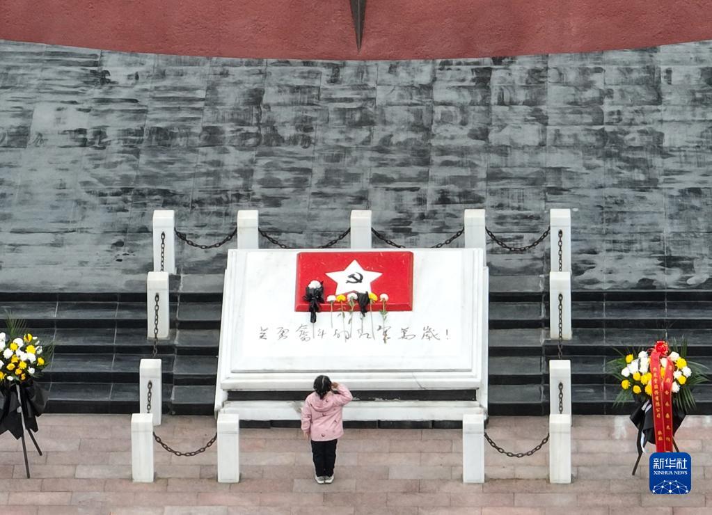 4月4日,在貴州省遵義市紅軍烈士陵園,一名小朋友在紅軍烈士紀(jì)念碑前敬少先隊(duì)隊(duì)禮,緬懷先烈(無人機(jī)照片)。