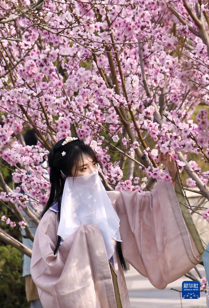 4月4日,一名身著漢服的姑娘在豐臺區(qū)世界花卉大觀園內(nèi)賞花拍照。(新華社記者 李欣 攝)