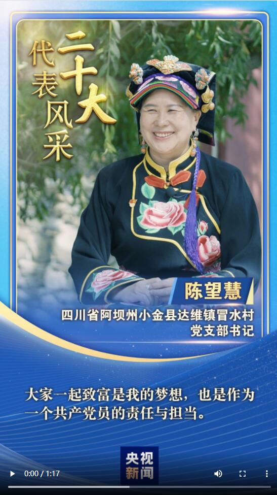 “二十大代表風(fēng)采”一起來認(rèn)識(shí)四川省阿壩州小金縣達(dá)維鎮(zhèn)冒水村黨支部書記陳望慧。