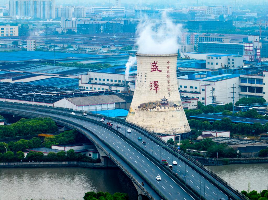 “沒想到一個小鎮(zhèn)就有‘三環(huán)’,早晚高峰還堵車。喲!這里還是‘中國絲綢第一鎮(zhèn)’?!备S記者一路調(diào)研的司機師傅說道。順著師傅的示意向窗外眺望,右前方高聳的白色冷卻塔,漸行漸近。塔上“盛澤”二字以及水鄉(xiāng)場景彩繪畫,讓這高55米、底部直徑約48米的冷卻塔,看起來像是一處“文化地標(biāo)”。